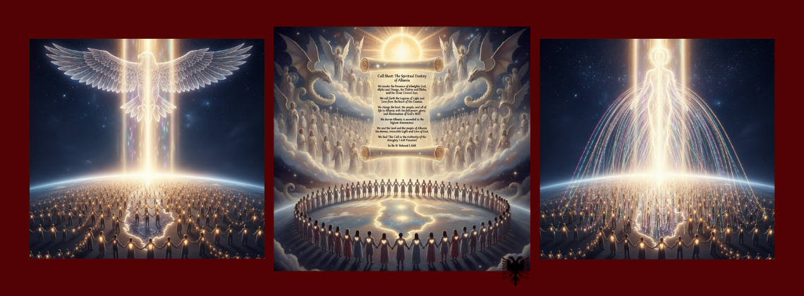 Në Emër të UNË JAM AI QË JAM, ne qëndrojmë në qendër të Zjarrit të Dashurisë. Ne i bëjmë thirrje drejtpërdrejt Shpirtit të Shqipërisë - kolektivit të lavdishëm të Mjeshtrave të Ngjitur, Shenjtorëve dhe Shpirtrave të Ndriçuar që janë ngritur nga kjo tokë dhe linjë gjaku e shenjtë. Ne pranojmë se Qendra e Zemrave të Shqipërisë është tashmë një realitet i ndezur në sferat eterike dhe tani urdhërojmë reshjen e saj në oktava fizike!